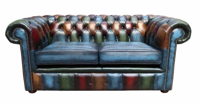 The Chesterfield Patchwork Classic Sofa. The Chesterfield Leather Sofa with it’s unique Low Back Style, Deep Buttoned Arms and Back complemented with a Buttoned Front Border. The Scroll Fronted arms on the Chesterfield Leather Sofa are attractively embellished with lines of individual stud nails. An undoubted winner in any room from the cottage to the boardroom. A classic of its kind ;Traditional Vintage British Style.
